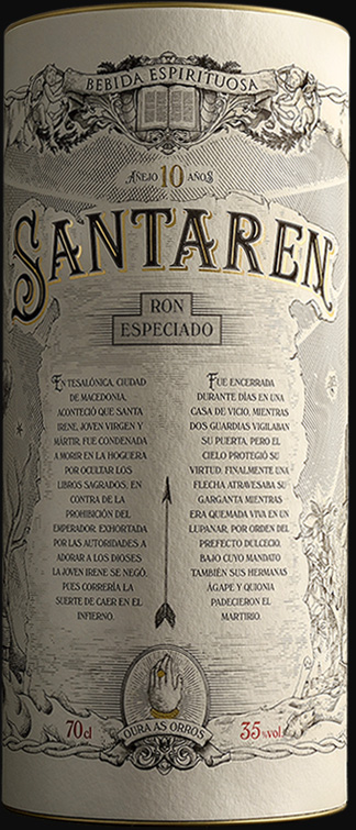 Santaren en un ron añejo especiado hecho en España, resultado perfecto de mezcla, infusion y maceración de especias secretas. Santaren es la mezcla de 4 rones, 2 de caña virgen sin envejecer de origen Español, ron de caña demerara y ron de caña dominicano envejecido 10 años, macerado lentamente y en la mas estricta oscuridad.